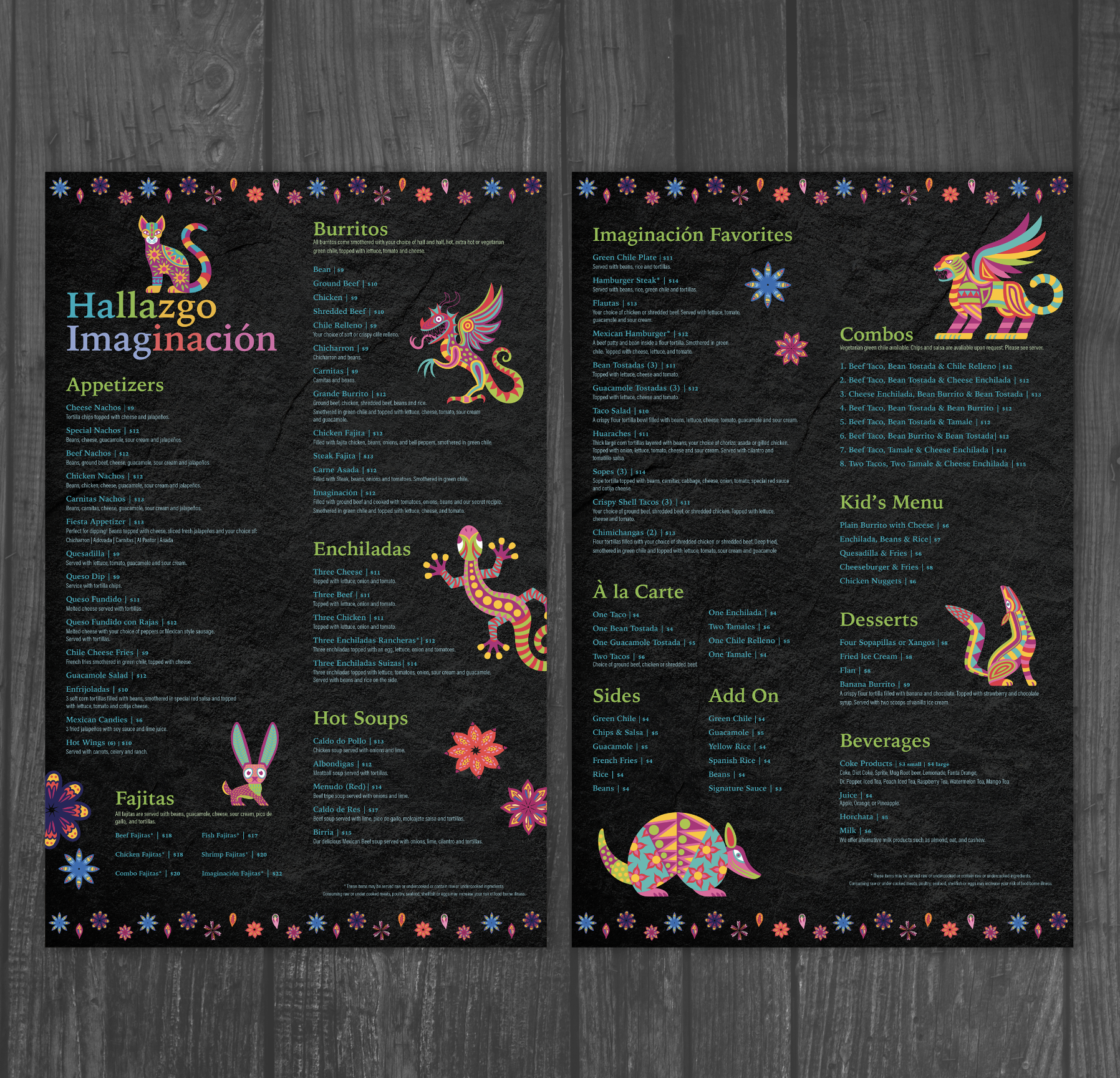 The layout for this Mexican restaurant menu design embraces the lively and colorful essence of Mexican culture, blending traditional with contemporary imagery to create an inviting and dynamic atmosphere. “Halazgo Imagination” meaning “Discover Imagination” was created as a playful spin on cultural Alebrejes.